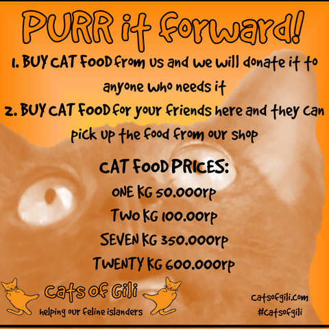 Osalistu meiän PURR IT FORWARD -kampanjaan, ja osta haluamas määrä kissanruokaa. Purr It Forward - kampanjassa jengi maksaa kissanruuan meille, ja myö ojennellaan näitä jo maksettuja kissanruoka-pussukoita niitä tarvitseville paikallisille kissaperheille.